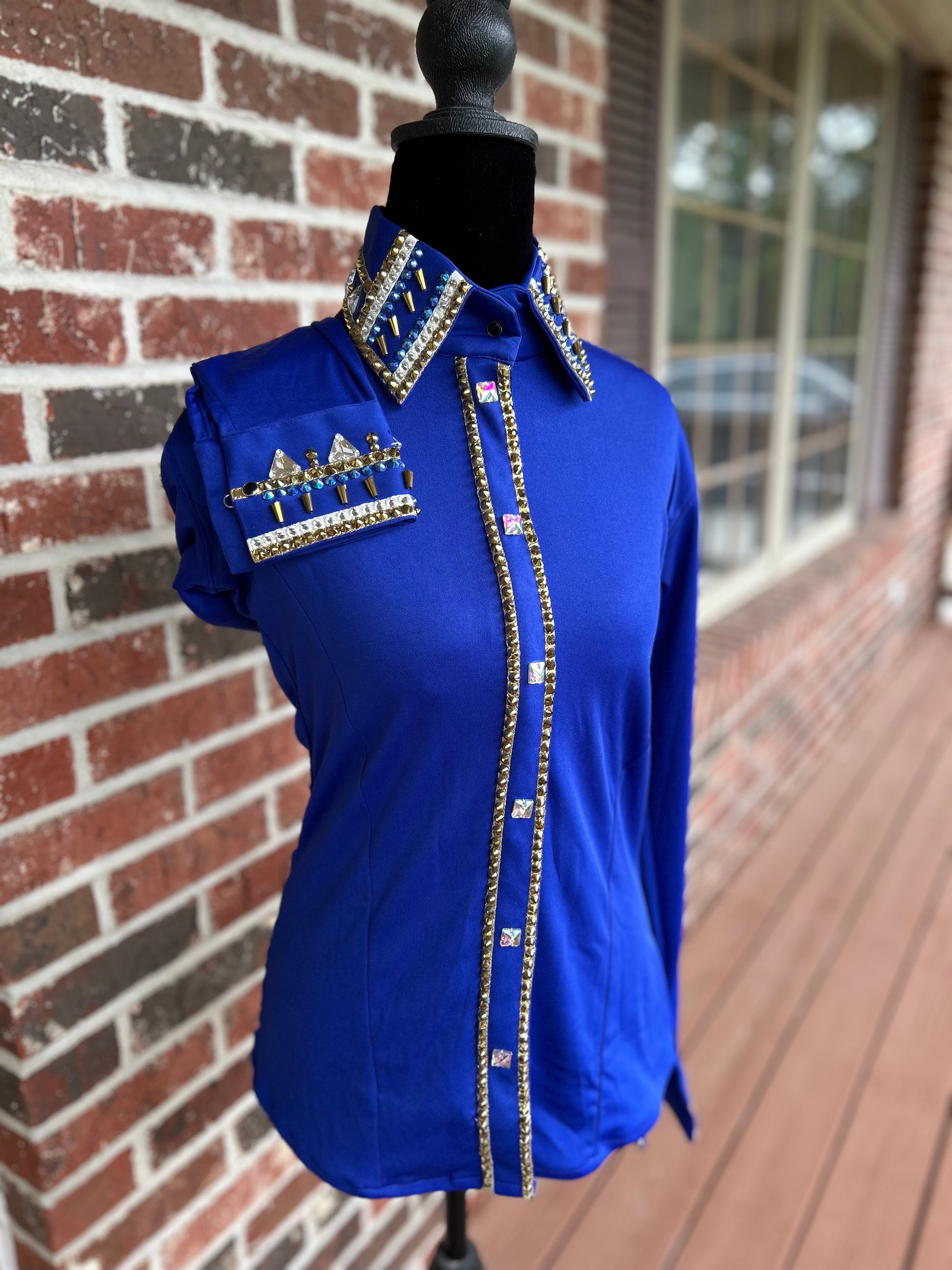 Blue Based All Day Shirt accented with Gold. Offers tons of stretch. Lycra material.
