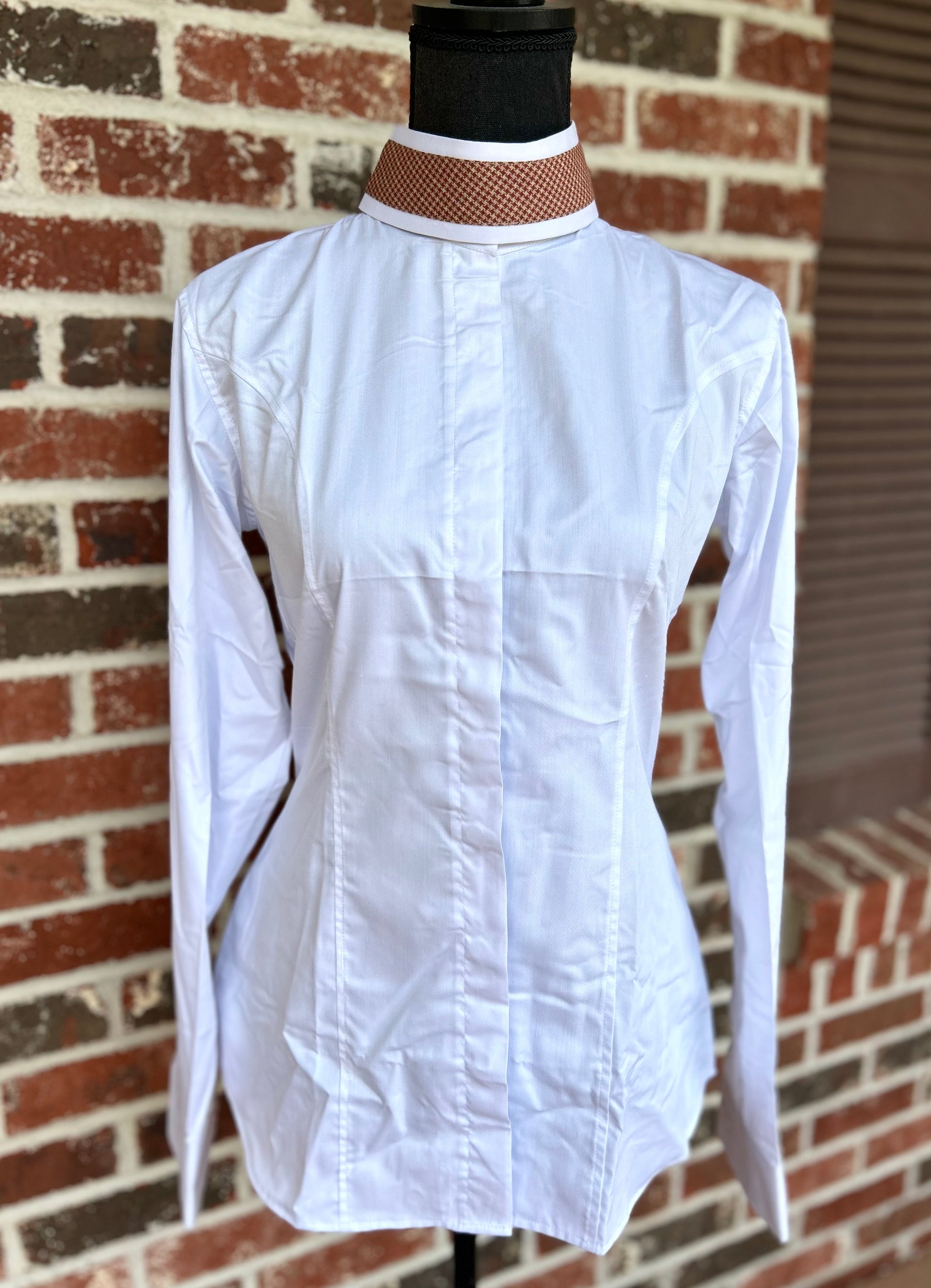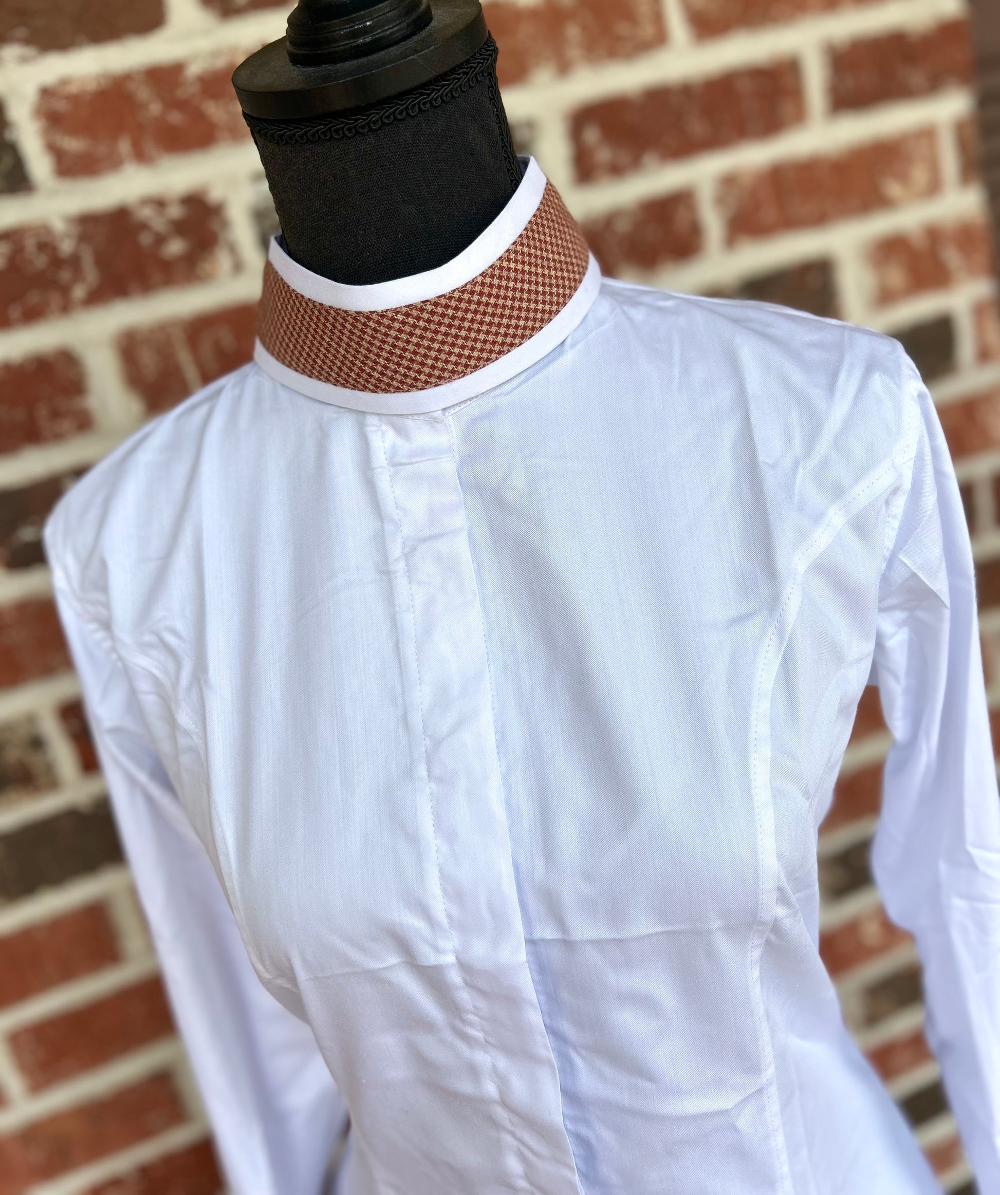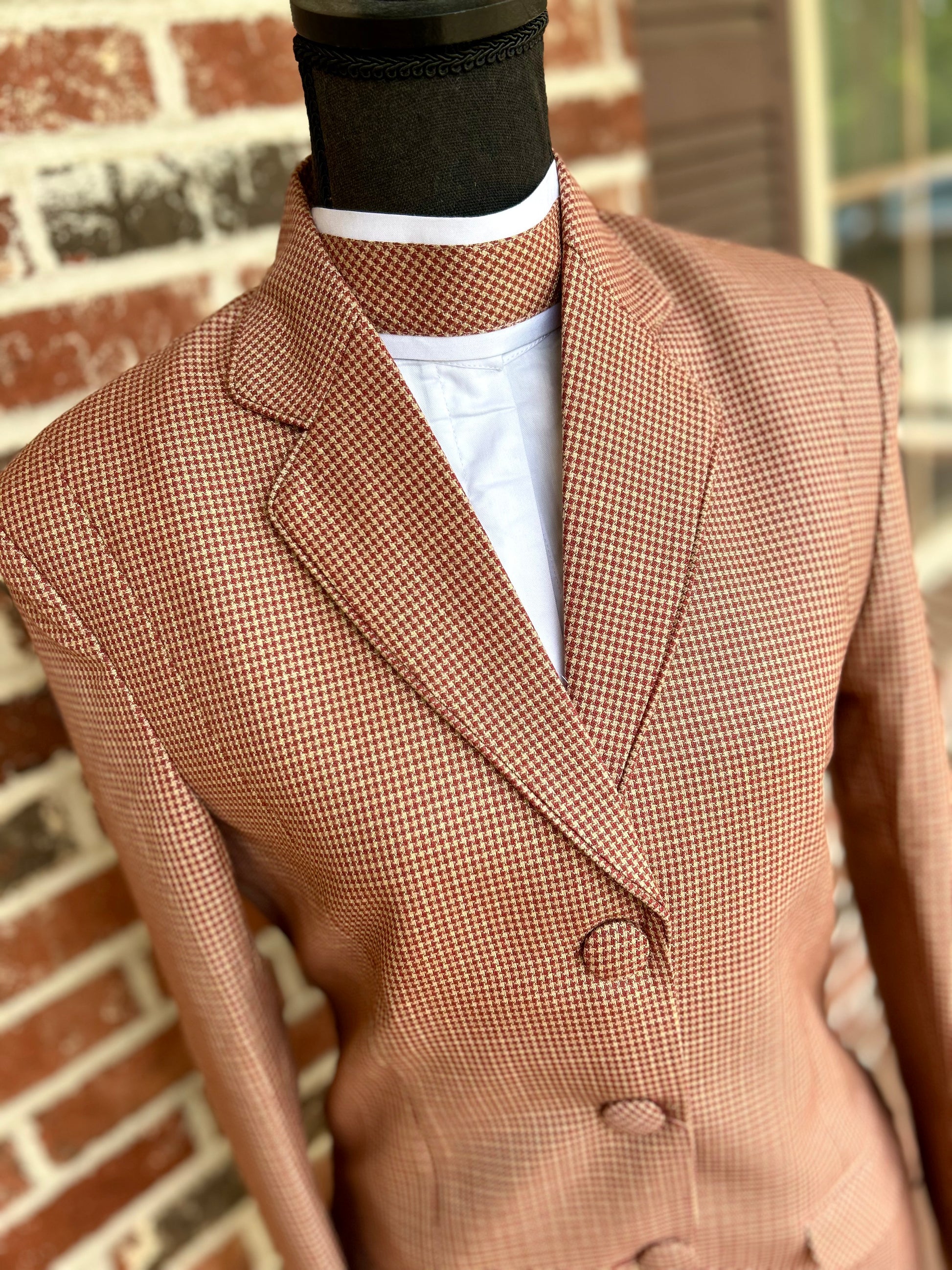 Brown Checkered Hunt Coat. Covered buttons. Paired with a white long sleeve shirt and matching collar. Collar is accented with brown checkered fabric.