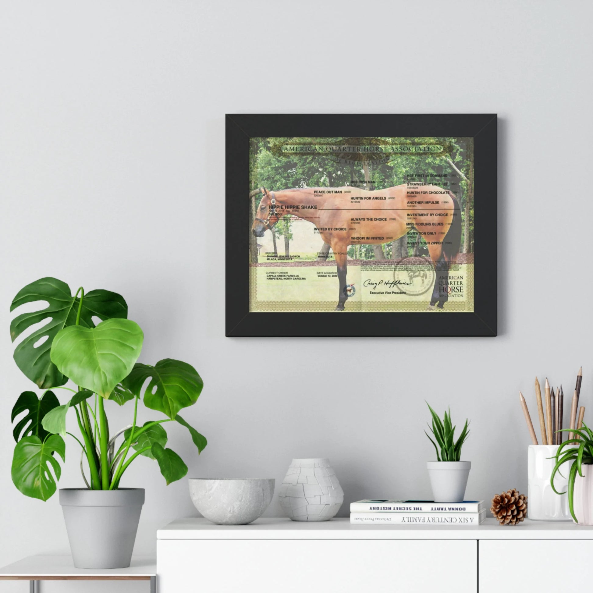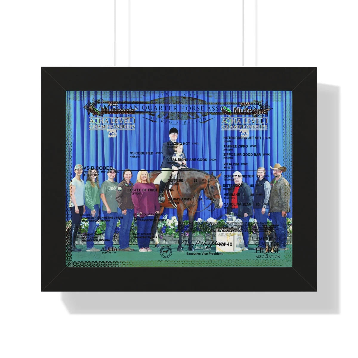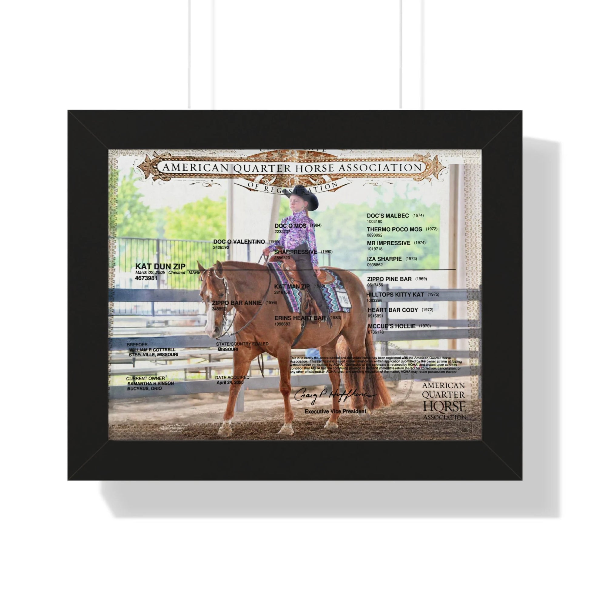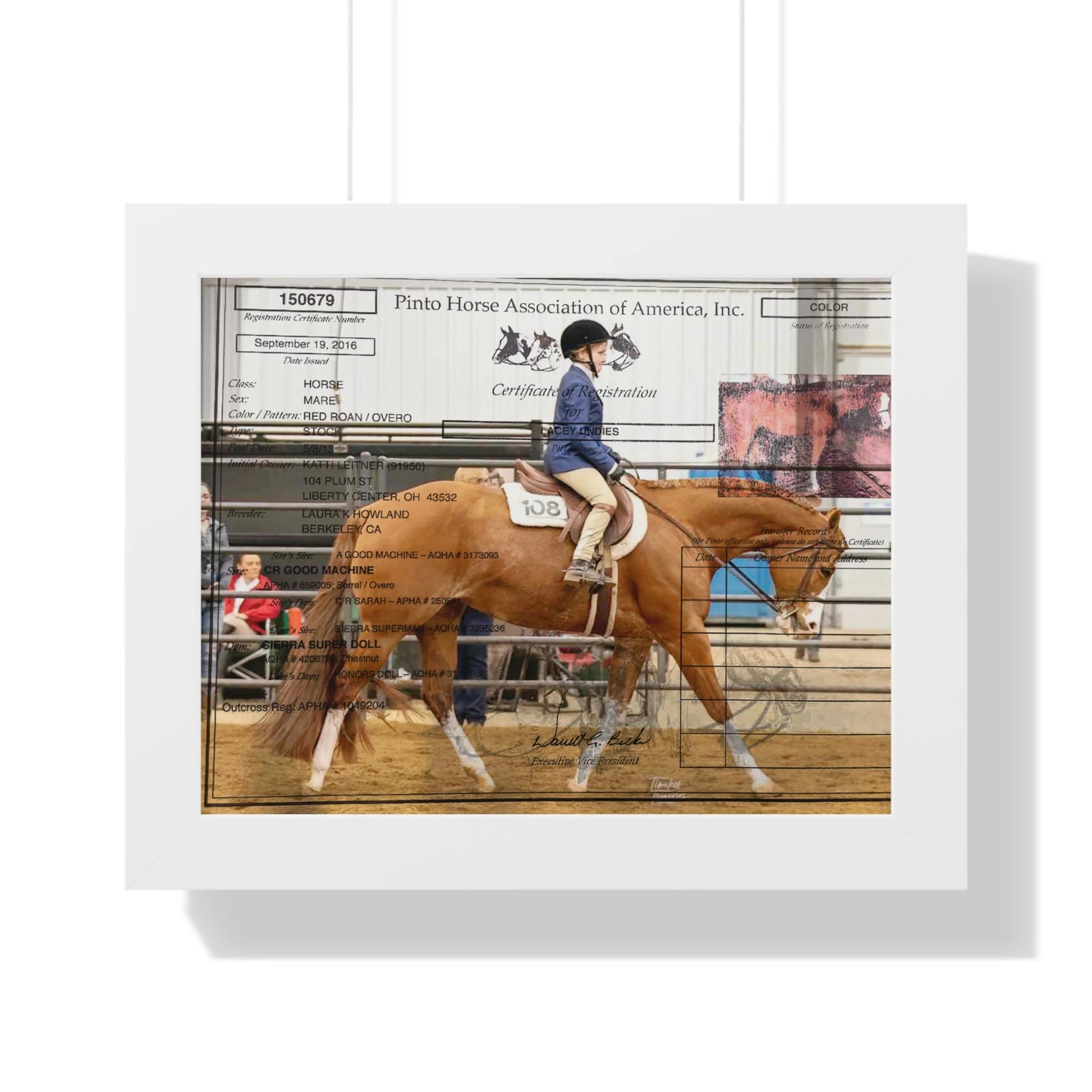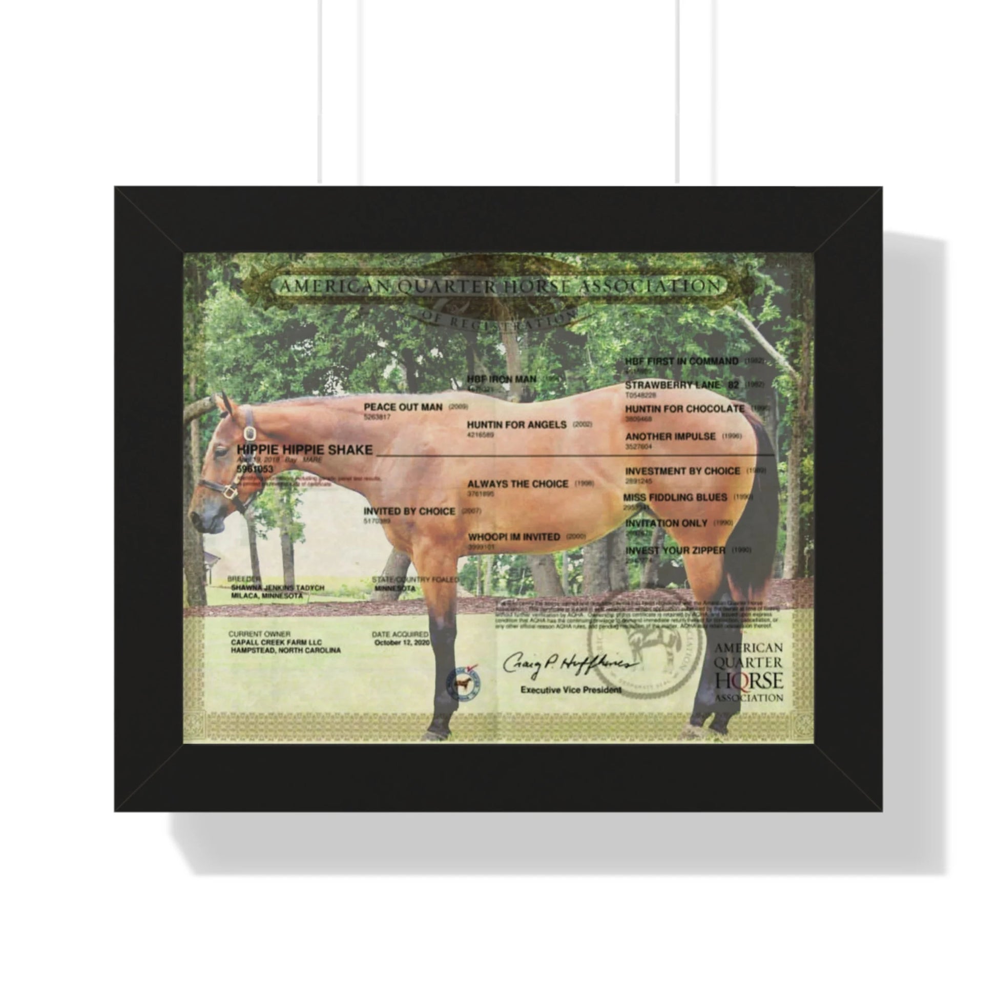 Combining a photograph of your equine partner with a clear photo of their Registration Paper, for a perfect keepsake. These displays can be placed in your home, the barn, or even in the horse trailer. Add your show photos, win photos, or those heartfelt candid moments for your display!