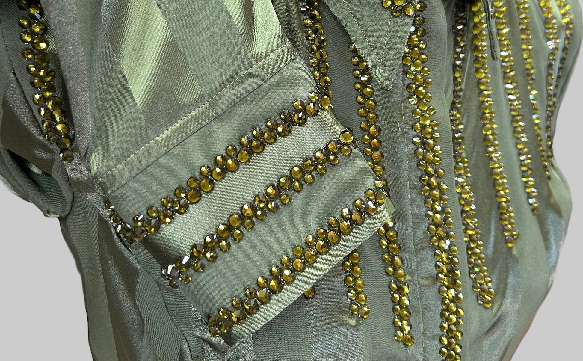 Classic olive green All Day Shirt designed for a clean, polished look in the show pen. Crafted with a soft, breathable satin base that provides both comfort and flexibility while maintaining a flattering, tailored fit.