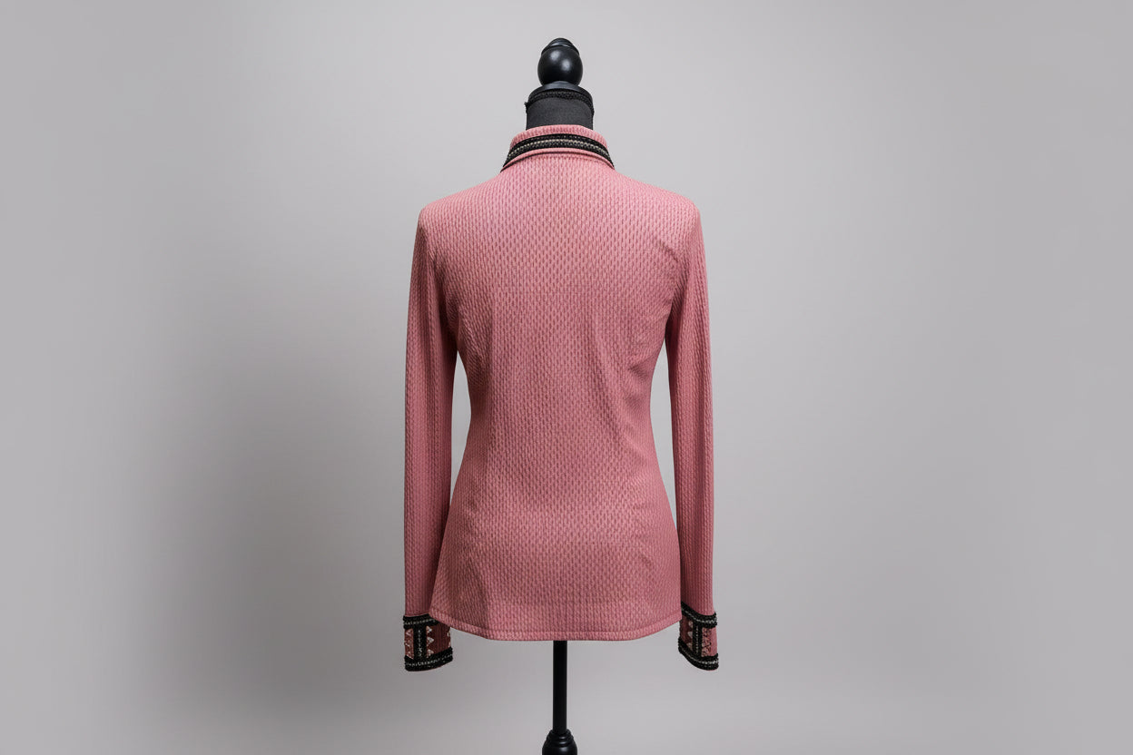 Beautiful pink scalloped All Day Shirt accented with black and charcoal grey for a bold yet polished look in the show pen. Designed with breathable stretch fabric to provide comfort, movement, and a flattering tailored fit while showing.