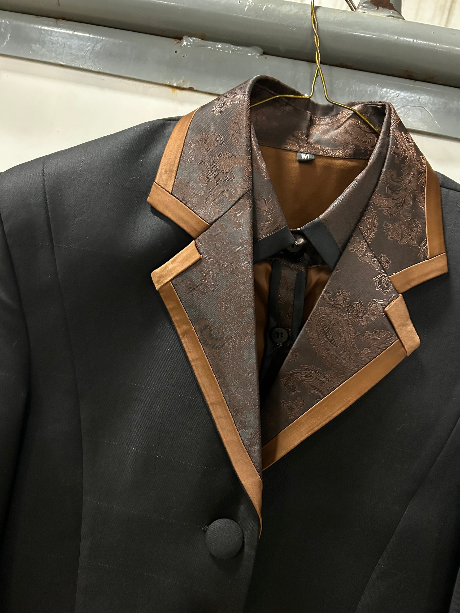 Classy custom made, Black based Suit by River Runs Show Pads. Accented with Chocolate brown and brown floral details. This is a personal item in my own collection. Approximately a Women’s XS/Small or can fit a tall youth. This rental includes the full suit: jacket, silk undershirt, and pants.